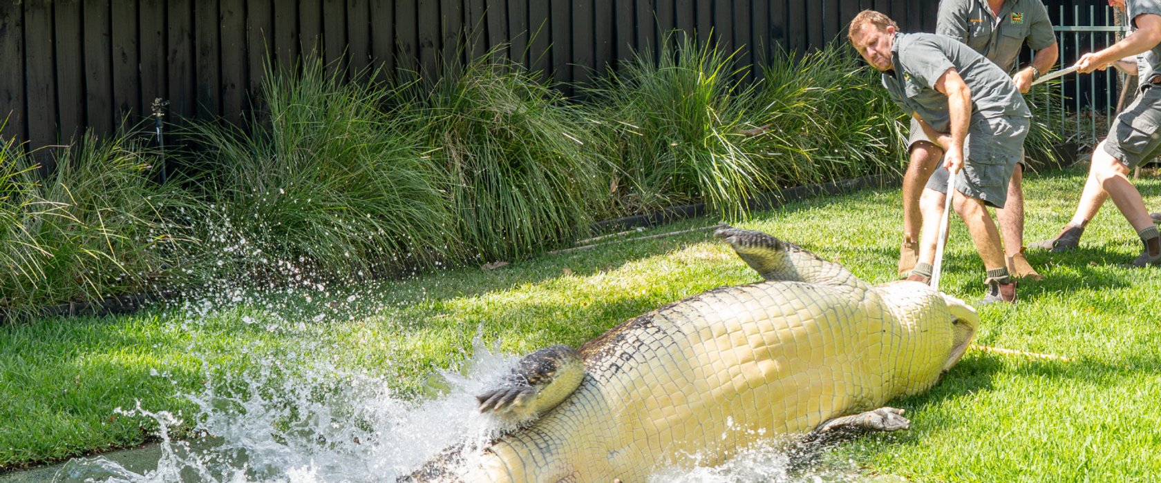 The Australian Reptile Park has once again come face-to-face with prehistoric power, successfully capturing Elvis the Crocodile who is the Reptile Park’s largest, most dangerous, and most notorious resident. Measuring an enormous almost 4.8 metres long and armed with bone-crushing jaws, Elvis is widely regarded as Australia’s crankiest crocodile, and with good reason. In his 14 years at the Reptile Park, he has only ever been captured three times due to the extreme risk involved.